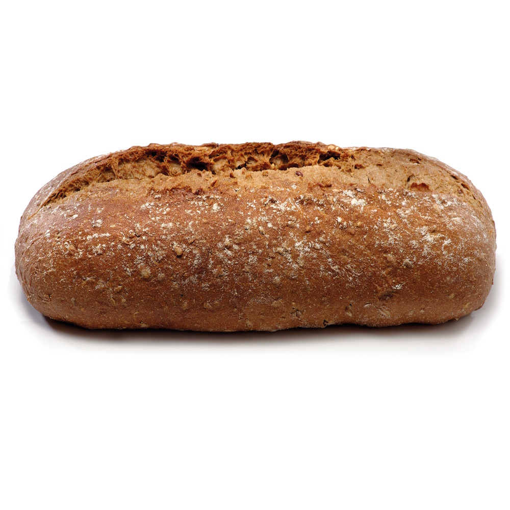 Dunkles Weizenmischbrot mit Sauerteig, Sonnenblumenkernen, Leinsaat, Roggen, Haferflocken, Hafervollkornmehl, Weizenflocken, auf Lavastein gebacken.