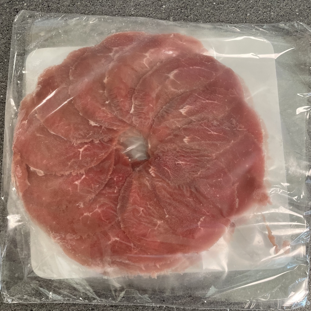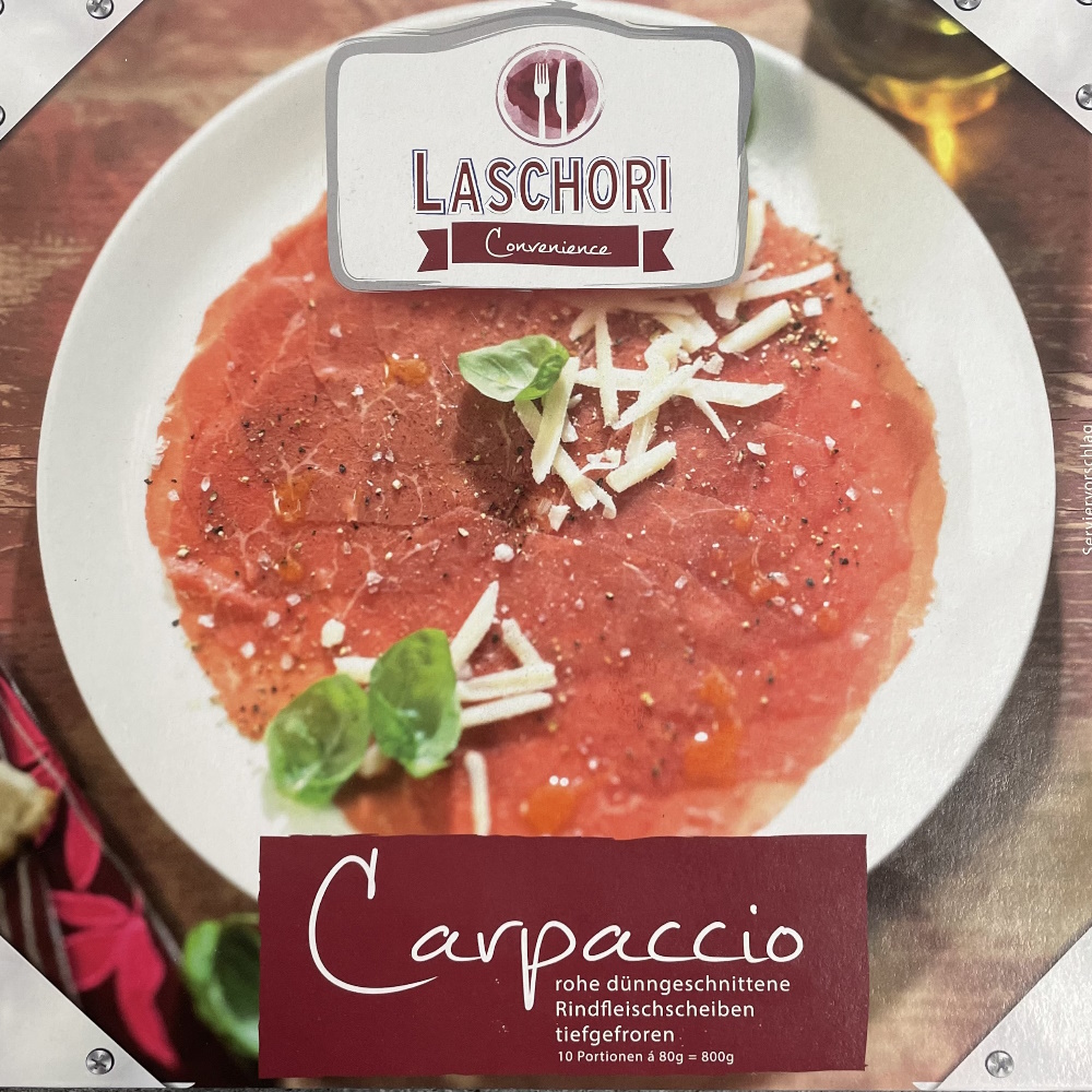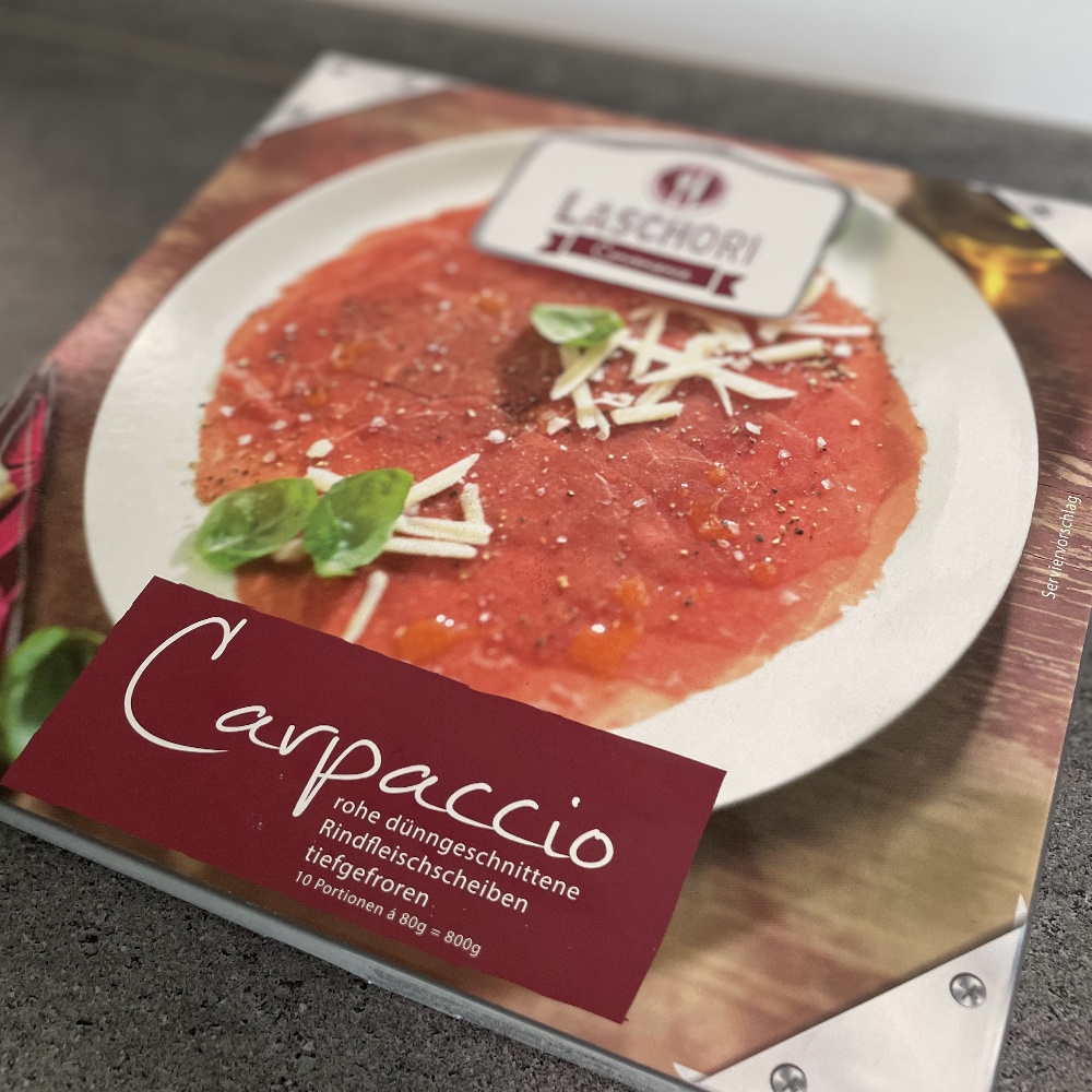 TIPP: Das Carpaccio gefroren (ganz wichtig) auf den Teller oder Platte legen, Folie abziehen und bei Zimmertemperatur auftauen lassen ca. 15 Minuten. Würzen mit Salz & Pfeffer, Olivenöl & Balsamico, darüber gehobelten Parmesan. Sehr lecker auch mit Rucola, feinen Tomatenwürfeln oder gehobeltem Trüffel.