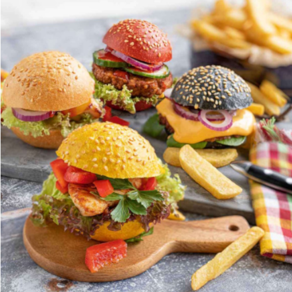 Jeweils 25 Party Burger pro Sorte:- FF-Mini Burger Sesam (1)- FF-Mini Yellow Burger Sesam (2)- FF-Mini Red Burger Sesam (3)- FF-Mini Black Burger Sesam (4)Diese Burgerbrötchen-Mischkiste punktet durch ihre Trendfarben, handliche Größe und einfaches Handling. Wecken Sie die Aufmerksamkeit Ihrer Kunden und Gäste durch attraktive Rezeptideen und eine tolle, abwechslungsreiche Optik. Als trendiges Fingerfood, kleiner Snack oder Komponente eines leckeren Burgermenüs, die PartyBurger schmecken einfach jedem.Vorteile:- Praktische Größe fürs Buffet- Schnell und unkompliziert zubereitet- Beliebtes Trend-Produkt- Ohne zugesetzten Zucker