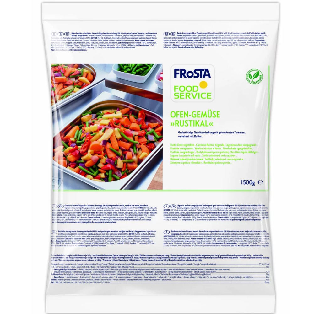 Grobstückige Gemüsemischung mit getrockneten Tomaten, Prinzeßbohnen, Karotten, gegrillter roter Gemüsepaprika, Pastinaken, roten Zwiebeln und Gewürzen, verfeinert mit Butter. Tiefgefroren.