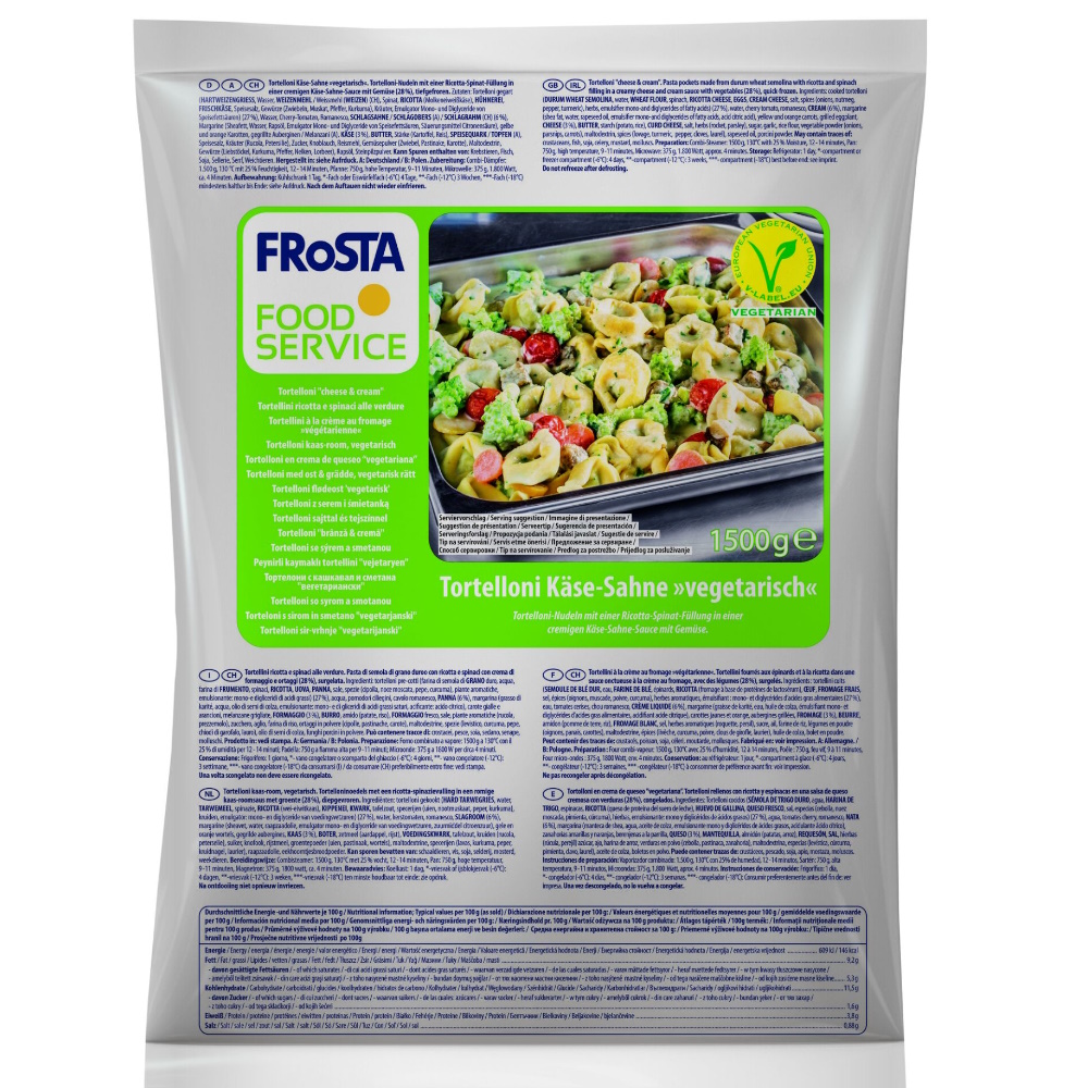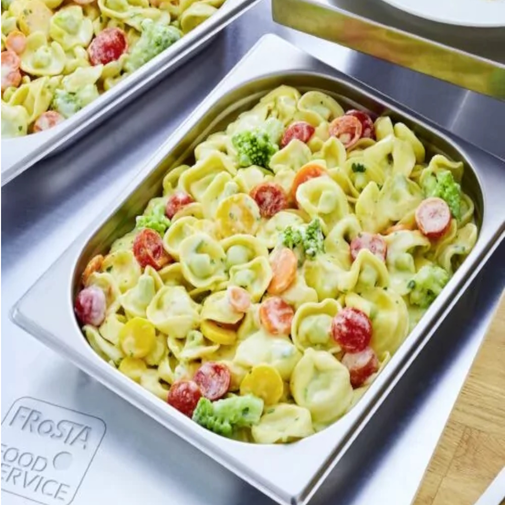 Vegetarisch & himmlisch cremig: Klassisches Nudelgericht aus hausgemachten und gegarten Tortelloni-Nudeln mit einer Ricotta-Spinat-Füllung in einer cremigen Käse-Sahne-Sauce mit Romanesco, Cherrytomaten, gelben Karotten & Gewürzen. Vegetarisch, super convenient und gelingsicher in der Zubereitung – insbesondere im Kombidämpfer. Tiefgefroren.