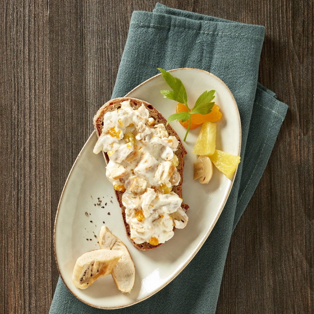 Ein herzhafter Salat aus zartem Hühnerfleisch mit fruchtigen Äpfeln, Ananas, Mandarinensegmenten, Spargel und Champignonscheiben in einer würzigen Salatcreme. Lecker vor allem zu frischem Brot!