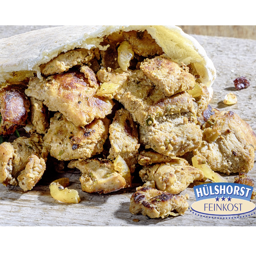 Mageres, geschnetzeltes Schweinefleisch, nach Gyrosart gewürzt und mariniert. Ohne Fett beige-braun bis dunkelbraun angebraten. Stückgröße ca. 10 - 50 mm. Prima portionierbar weil einzeln entnehmbar.