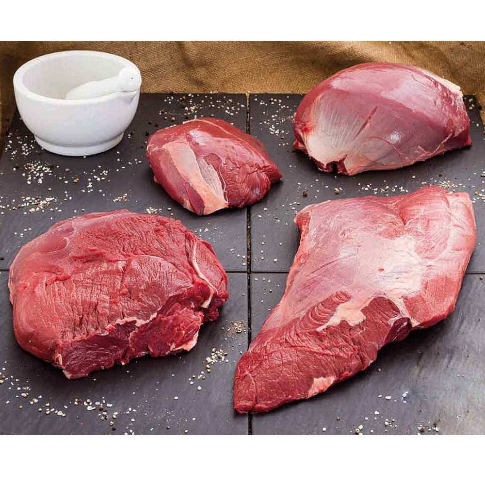 Hirschkeule 4er Schnitt bedeutet: Die Keule wird entlang der natürlichen Muskelverläufe in Oberschale, Unterschale, Hüfte und Nuss zerlegt. Sie eignet sich hervorragend als Braten oder für einen saftigen, edlen Gulasch. Als Medaillons geschnitten ist sie ideal zum Kurzbraten.