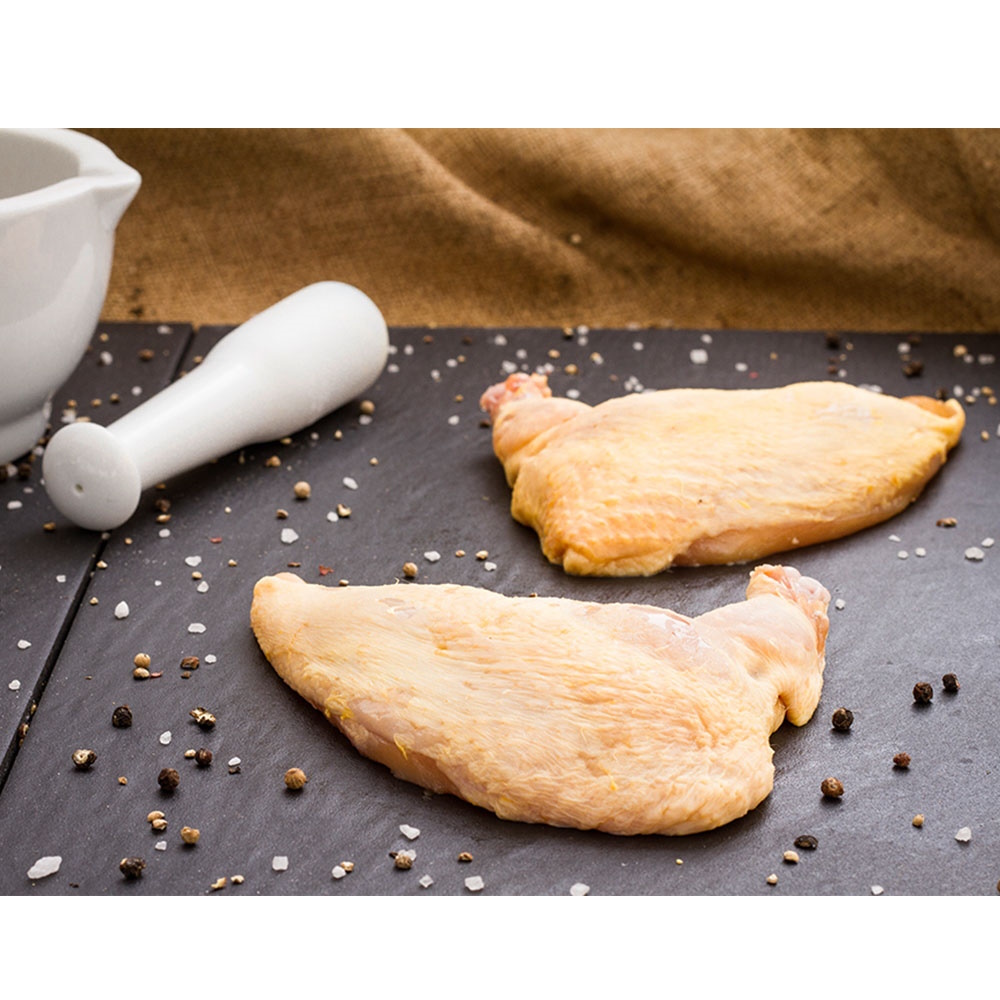 Hähnchenbrust mit kleinem Flügelknochen, darum besonders saftig.