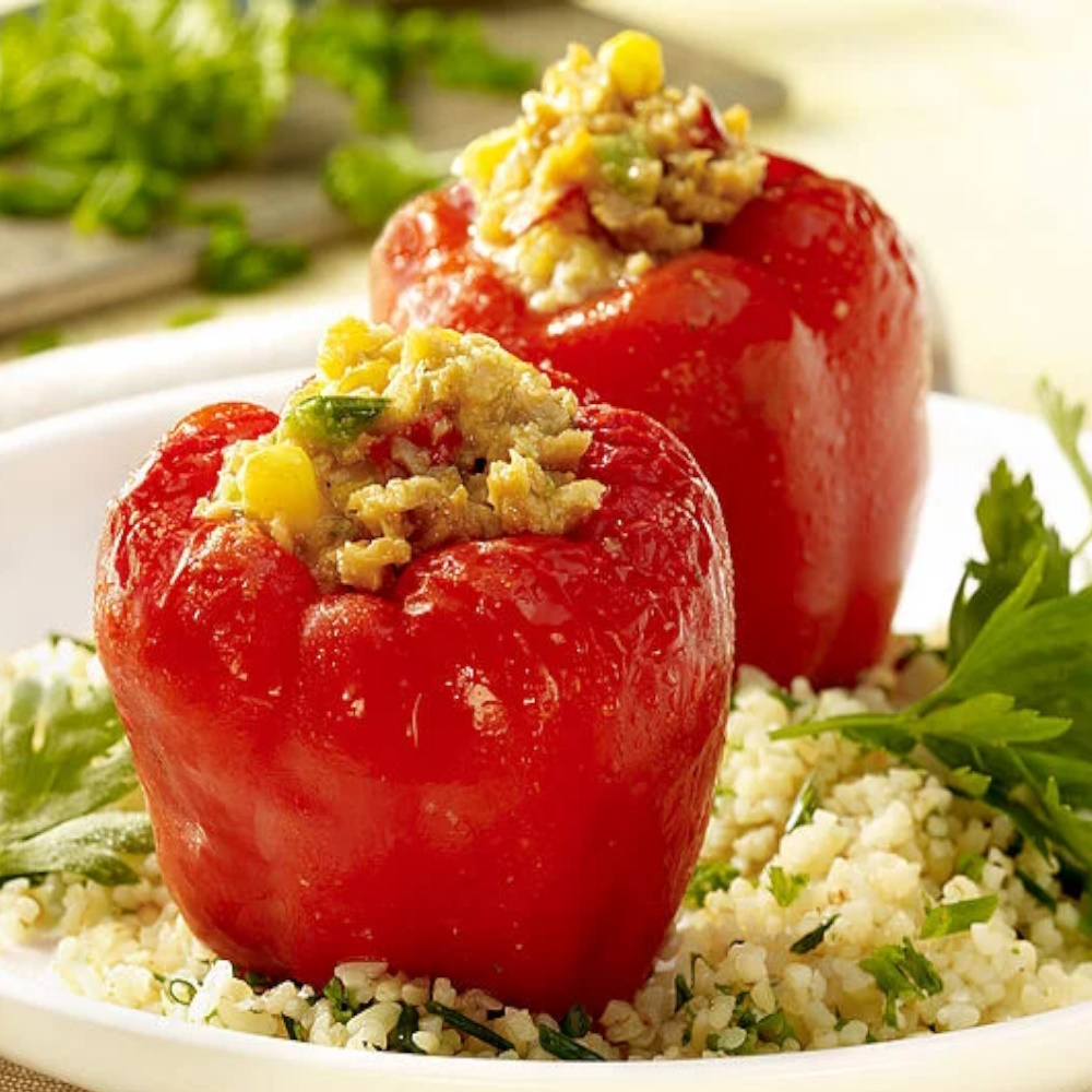 Rote Paprikaschote, herzhaft gefüllt mit Erbsen- und Weizeneiweiß sowie buntem Gemüse.