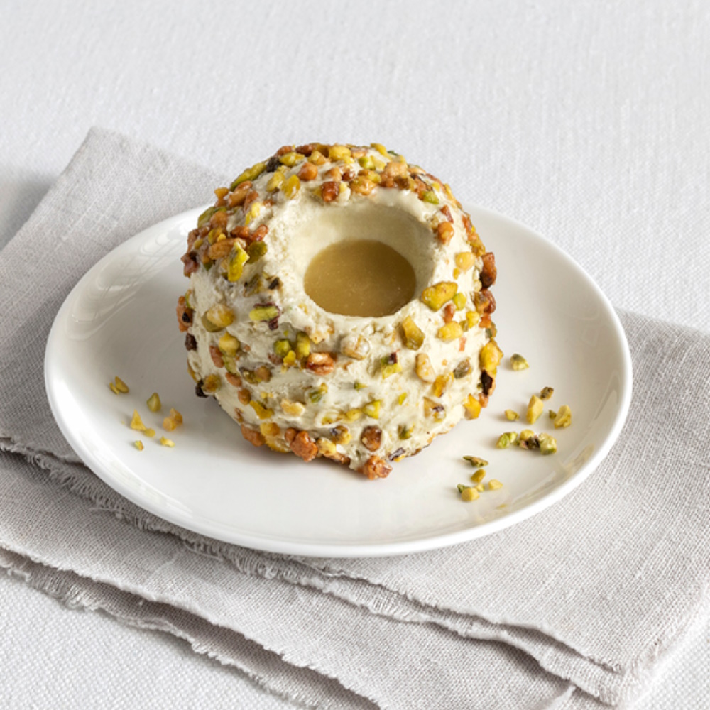 Eine leckere Kombination aus Pistazieneis gefüllt mit Pistaziensauce und ummantelt mit Haselnuss- & Pistazienstückchen. Frei von künstlichen Farbstoffen und sofort servierfertig.